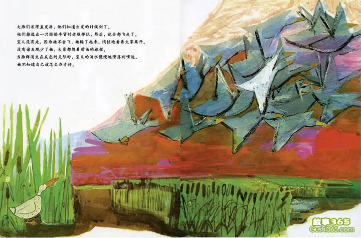 没有羽毛的大雁 他们推选出一只经验丰富的老雁带队,然后,就全都飞走了。 宝儿没有走,因为她不会飞,谁都没有发现她。当雁群消失在灰色的天际时,宝儿的泪水慢慢地滑落到嘴边。 她不知道自己该怎么办才好。 没有羽毛的大雁 8/15 首页 上一页 6 7 8 9 10 11 下一页 尾页 【没有羽毛的大雁 - 故事绘本 - 故事365】从前,有一对大雁夫妇,他们是波朗先生和夫人。他们住在靠近英格兰东岸的一片空旷的沼泽地里。每年春天,波朗夫妇都会回到沼泽地,修整他们的窝。然后,波朗太太安顿下来生蛋https://www.gushi365.com/info/18491.html 手机用户点击浏览器底部 ≡ ↗ 或右上角 ┅ 等按钮,收藏或分享到朋友圈 赞 订阅 微信扫一扫,订阅「故事365」