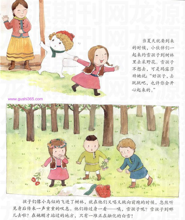 孩子们像小鸟似的飞进了树林,就在他们又唱又跳向前跑的时候,忽然听见身后传来一声重重的叹息。他们转过身一看--咦,雪孩子呢?雪孩子到哪儿去了?在她刚才站过的地方,只有一堆正在融化的白雪!