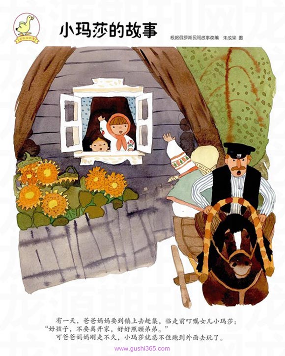 有一天,爸爸妈妈要到镇上去赶集,临走前叮嘱女儿小玛莎:“好孩子,不要离开家,好好照顾弟弟。”