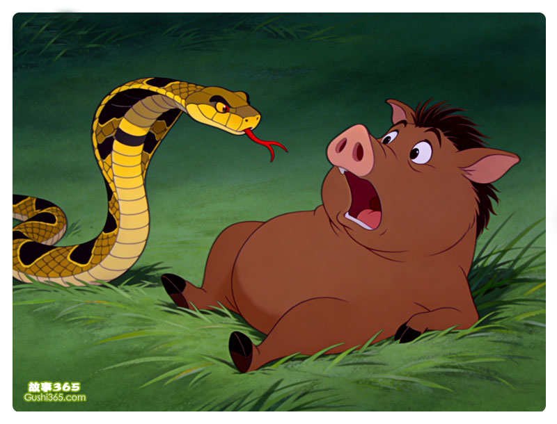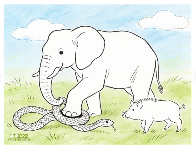 小野猪指着一旁草丛中死了的眼镜蛇,说:“刚才我玩儿累了,躺在草地上休息。突然一条眼镜蛇向我冲过来,吓得我哇哇大叫。幸亏大象及时赶到,一脚把眼镜蛇踩死了。” 野猪妈妈这才恍然大悟。这时,恰好乌鸦飞过来,便生气地说:“都怪你!你没有看清楚怎么可以瞎说呢?”