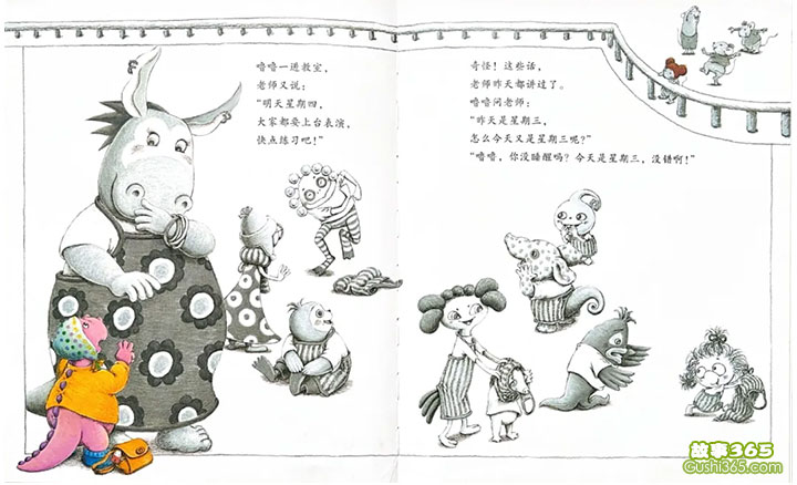 噜噜一进教室,老师又说明天是星期四,大家都要上台表演,赶快练习吧!奇怪!这些话老师昨天都讲过了!噜噜问老师:“老师,昨天是星期三,今天怎么又是星期三呢?”老师像昨天一样放音乐、喊口令:“一二三四、二二三四。”而老师也像昨天一样纠正噜噜的动作,“噜噜第一次抬左脚、第二次抬右脚。噜噜请你拍拍手、不要摇摇头。”手忙脚乱的噜噜紧张的快哭出来了。一不小心,他的大尾巴又扫到了大眼兽。大眼兽又狠狠地瞪着他。