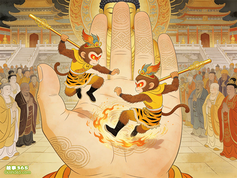 真假美猴王一直厮打到灵山,要让如来佛辨个真伪,说出是非。在佛法无边的如来面前,六耳猕猴最终闹了个原形毕露,自食恶果。