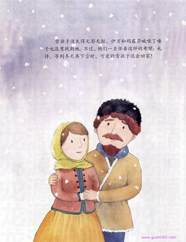 雪孩子消失的无影无踪,伊万和马露莎喊哑了嗓子也没有找到她。不过,他们一直怀着这样的希望:也许,等到冬天再下雪时,可爱的雪孩子还会回家。