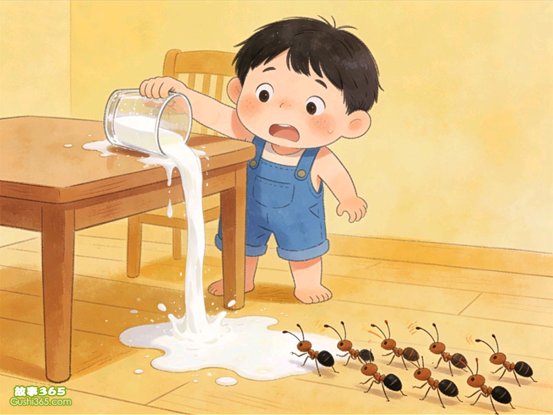 一大清早,乐乐就不小心洒了一杯牛奶,白花花的牛奶流了一地。浓浓的奶香引来了蚂蚁哨兵:嘀嘀嘀——嘀嘀嘀——招来了一大群蚂蚁兵,“哎呀,好香的牛奶河啊。”小蚂蚁们有的拿桶,有的拿盆,还有的拿着杯忙把牛奶往洞里搬。洞里还有好多好吃的呢!有香香的饼渣,肥肥的红烧肉,还有一粒粒诱人的饭干……